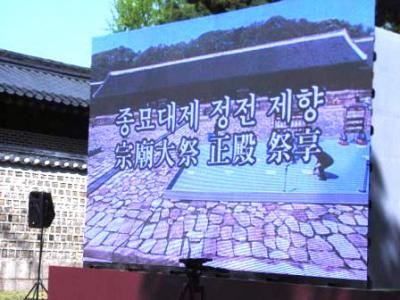 祭祀は宗廟の中で行われるので、外で見物している人たちのために、大きな画面が用意されています。