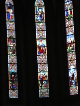 ステンドグラスは正面がロザリオ祈り15段のイエスの生涯をあらわしたもの、向かって左は生誕と三博士の拝謁、右がイエスと12使途をあらわしています。