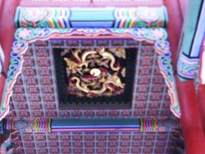 一見2階建てのように見えますが、中は吹き抜けで高い天井には七爪の龍が描かれています。