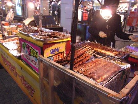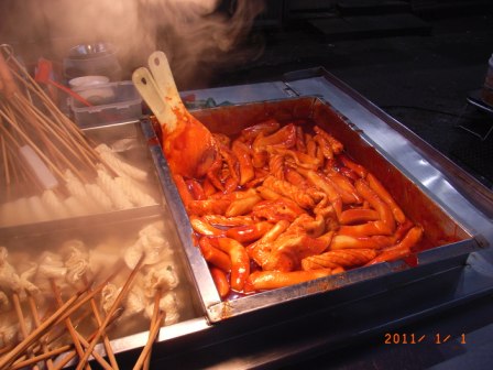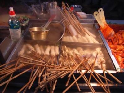 名物のテジクッパの店、ククス(うどん)の店が並び、道の中央にはおでん、マンドウ、チヂミ、餃子、トッポッキ、てんぷらなどを売る屋台が並びます。