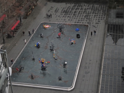 ものすごく斬新な彫刻群と噴水。夏には子供が無邪気に水と遊ぶ光景が見られます。