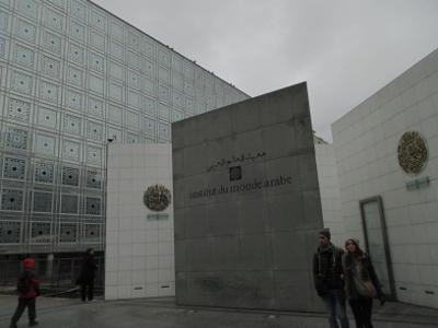 建物はとても現代的で、金属の部品を重ねて作った文様が、アラベスク模様になっています。アラブの窓飾りのマシュラビーヤをヒントに作ったそうですよ。