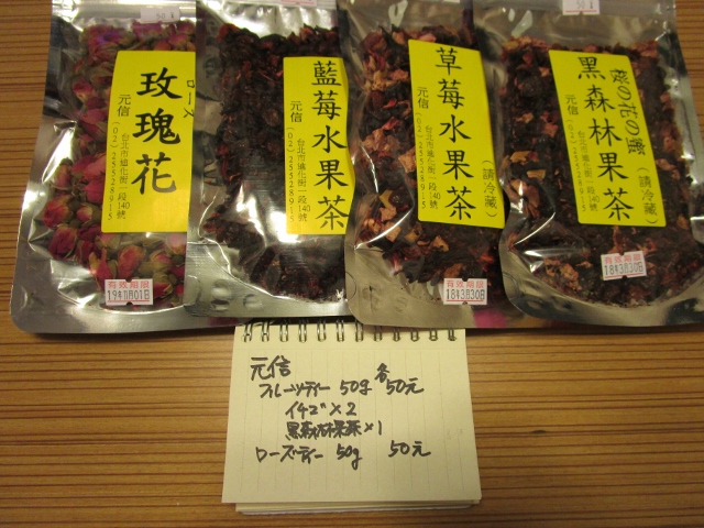 フルーツティー(水果茶)は他のお店は大概100g包装ですが元信では50gのパックで一つ50元。お土産にするのに便利なサイズです。それに種類が多いのもうれしい。