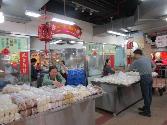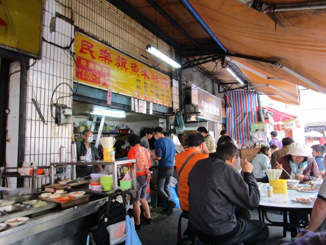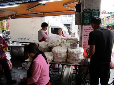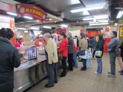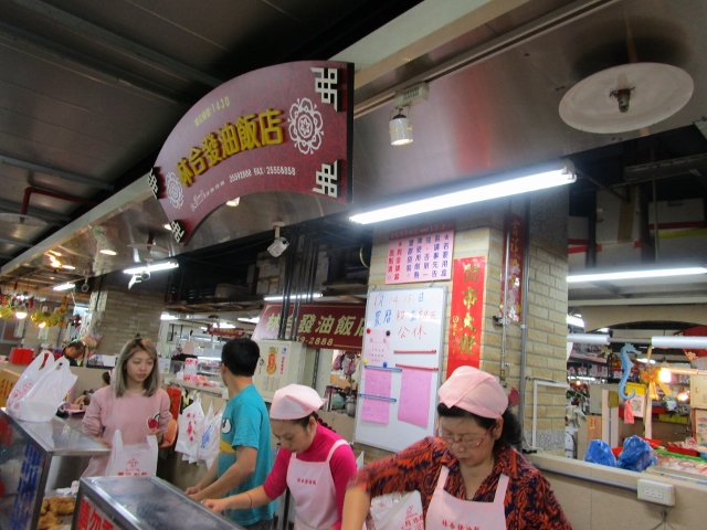 有名店の林合發油飯店には市場の外まで続く長い行列。10分ほどで買えました。