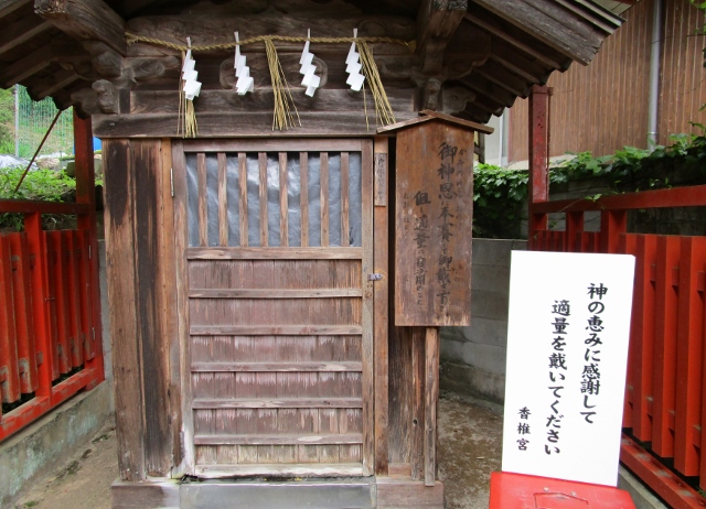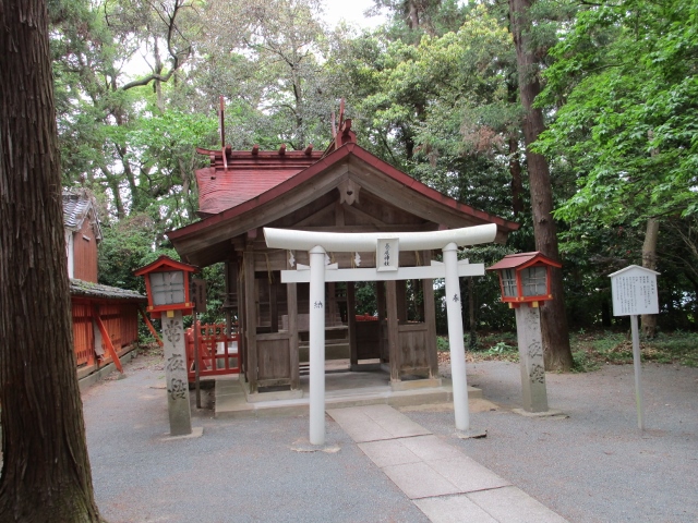 楼門を入ってすぐ右手、ベンガラで朱に染められた玉垣の中にあります。