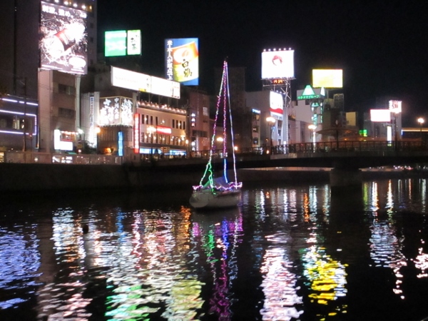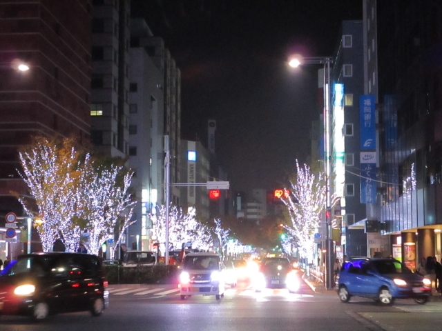中洲方面からイルミネーションで美しい光景の中を歩いていくと、これまた美しくライトアップされた博多駅に着きます。
