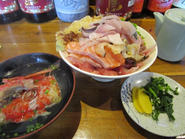 てんこ盛りの海鮮に魚のアラのお吸い物。