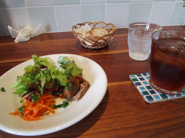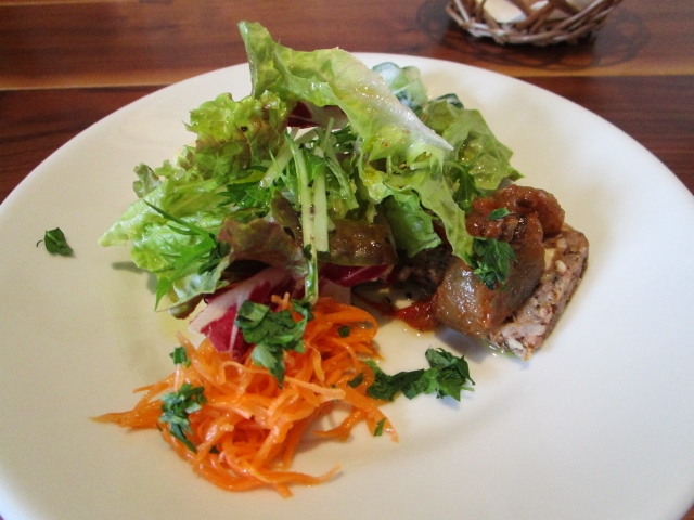 前菜の盛り合わせは、サラダと一見お肉のパテ??と思ったのですが、お肉を使わないパテなのだそうです。味付けはフランス風のシンプルなワインビネガーとオリーブオイル。