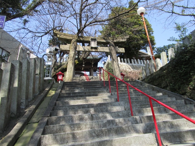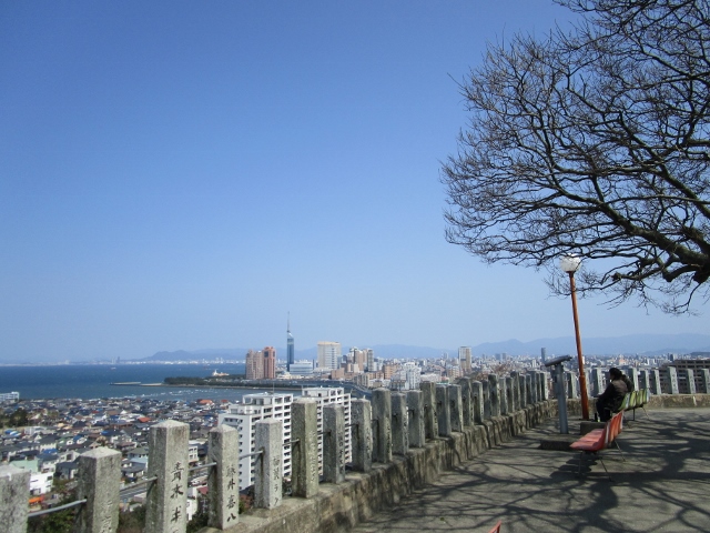 急な坂道と、階段・・・ちょっとアクセスは大変ですが、その分頂上にある神社の境内からは、博多湾と博多の街を一望できて壮観です。
