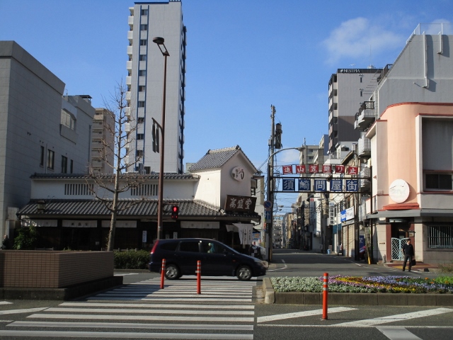 石村萬盛堂 本店は須崎の問屋街のゲートとなり、博多祇園山笠の廻り止めにあります。