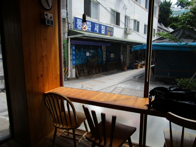 大きな窓からは宝水洞の古本屋通りと広場が見えます。
