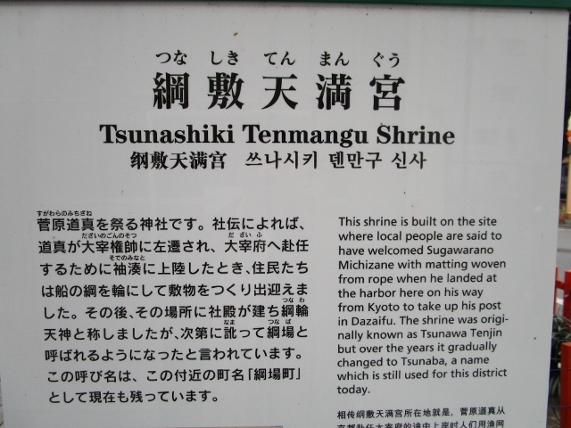 綱敷天満宮と名のつく神社は神戸の東灘区、須磨区、 愛媛県今治市、福岡県築上町にもありますが、どの神社も道真公が京都から大宰府天満宮に向かう折、休憩に立ち寄った際に漁人が舟の綱を輪にして敷物を作って出迎えたという伝説を由来としています。