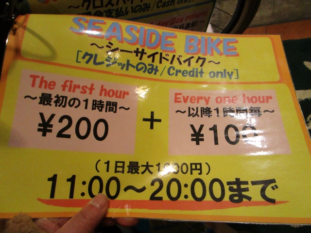 シーサイドバイク:クレジットカードで最初の1時間が200円 その後は100円/時間