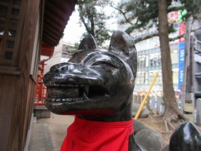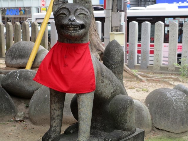 入ってすぐにある一対のお狐さんはとても怖いお顔をしていますが、奥にあるもう一対のお狐さんはなんと笑っています。
