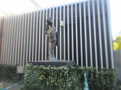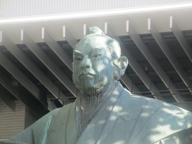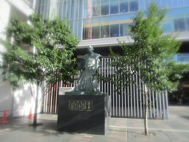 西公園の黒田武士の銅像は、槍を立ててますが、こちらは斜めに構えています。