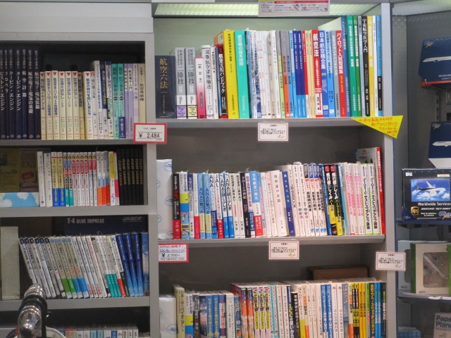 プラモデルやフィギュアのほか、専門書もたくさん。パイロット入試問題集なんてカタい本から、航空業界裏事情なんて柔らかい本までありました。