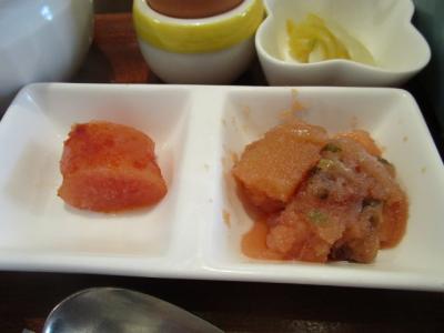 お代わり自由の明太子。お味噌汁もおいしいし、いろんな味が試せるところがいいと思います。卵もこだわりの卵なんですよ。