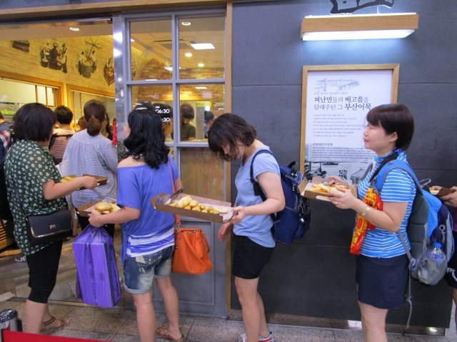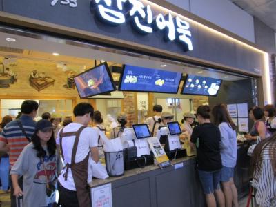 釜山駅で何やらすごい行列が・・・影島に本店があるサムジンオムク(サムジン蒲鉾)の釜山駅ショップです。2階にあるのですが、ものすごい混雑。