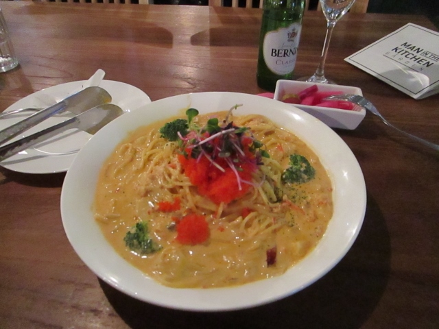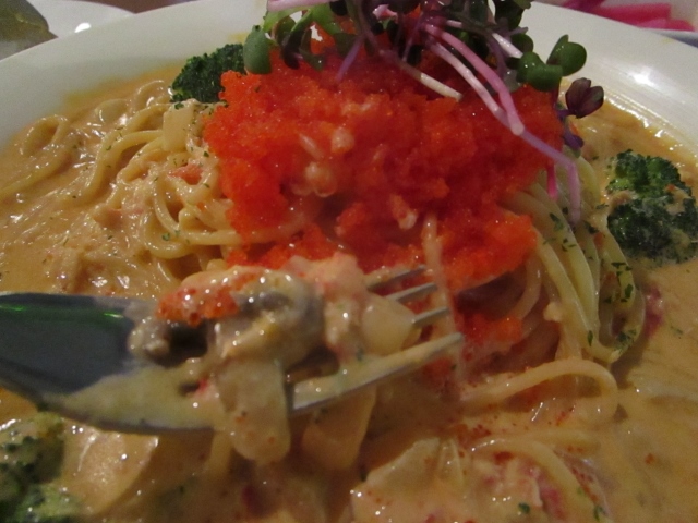 ちょっと辛めの味付けのクリーム系パスタで、おいしいんですけど半分しか食べれませんでした。