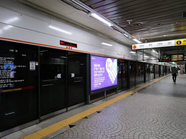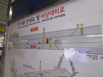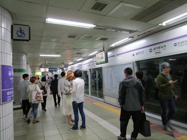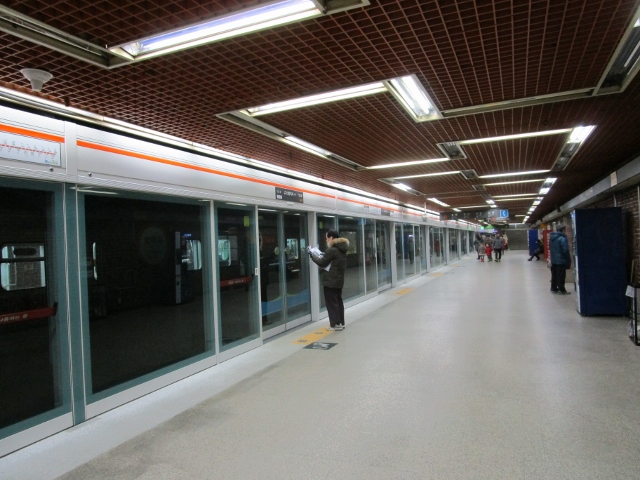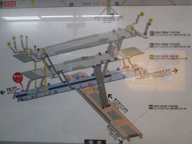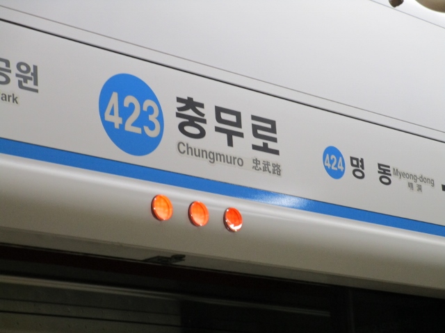地下鉄忠武路駅は地下鉄3号線(オレンジのライン)と4号線(水色のライン)の乗換駅。