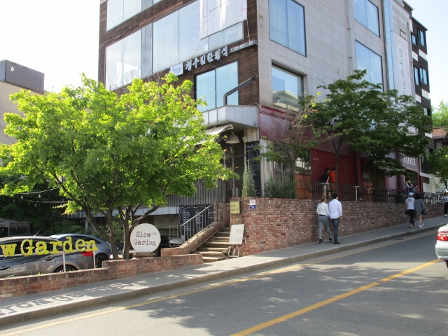 南山韓屋村の入口から、まっすぐ、広場を通り過ぎて緩い坂道を上っていくと左手に国楽堂の入口の門があります。これをくぐって正面にあるのがこのカフェです。