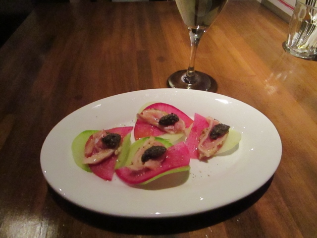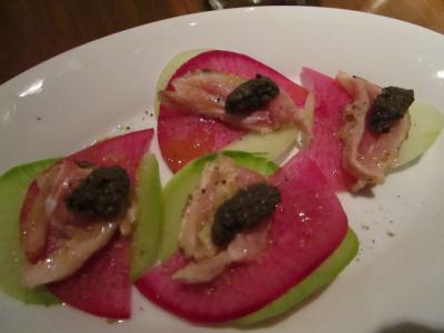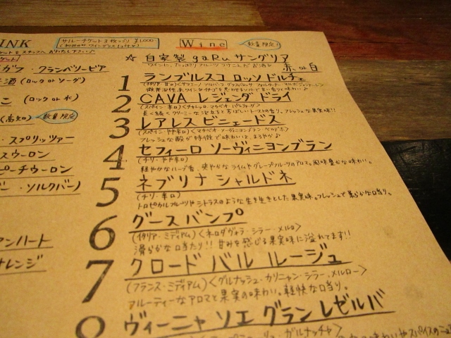 3枚1000円のチケットでドリンクと交換。ドリンクは白ワイン、赤ワイン、スパークリングなど。サルーメニューは赤鶏とカラフル大根の冷製、オリーブなど300円から。