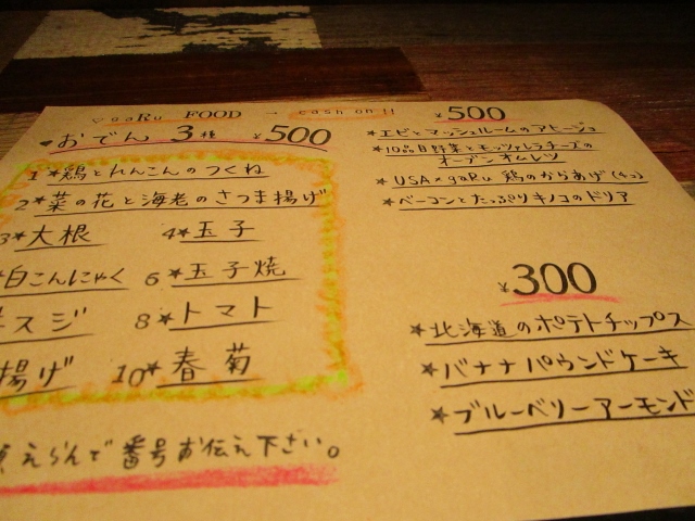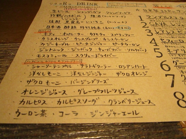 3枚1000円のチケットでドリンクと交換。サルーのドリンクメニューはは焼酎、日本酒(熱燗のみ)、梅酒など。