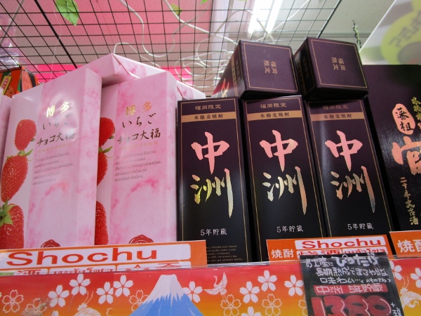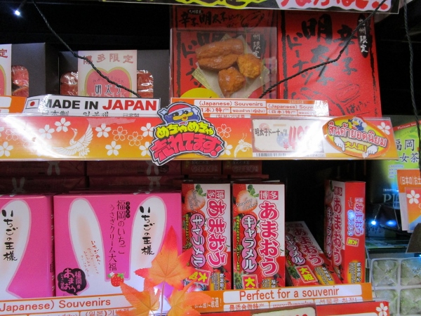 ここは歓楽地にあるため、中州、博多のご当地ポッキーや博多限定あまおうキャラメル、明太子ドーナツなど、名物を使ったお菓子など、ばらまき土産にとても重宝するものを大量に売ってあります。