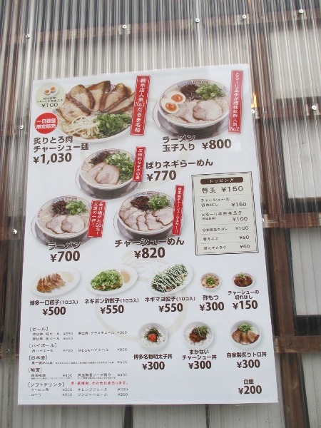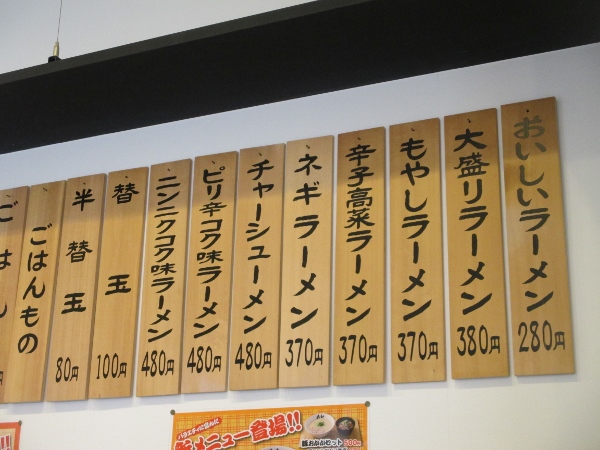 大盛りラーメンは380円、もやしラーメン、辛子高菜ラーメン、ネギラーメンは370円、チャーシューメン、ニンニクコク味ラーメンは480円