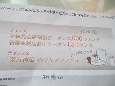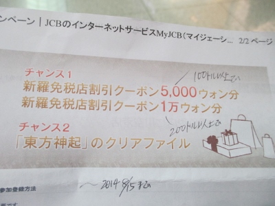 2014年は8月15日までのサービスとして、東方神起のクリアファイルをもらえたり、100ドル以上のお買い物で5000ウォン、200ドル以上のお買い物で1万ウォンの値引きが受けられます。