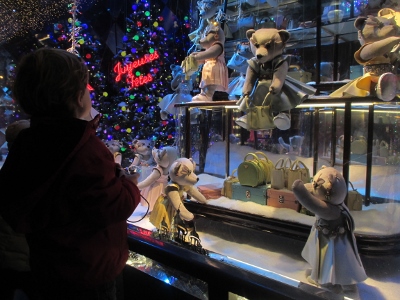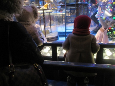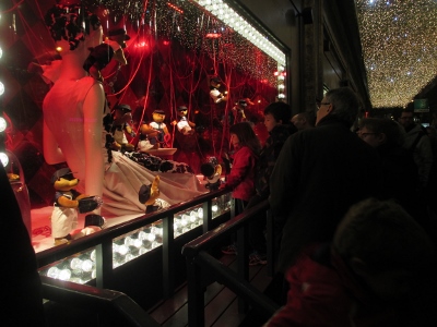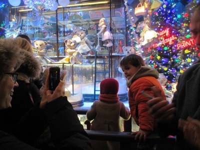 ショーウインドウ前は人の山。子供が喜ぶ仕掛けがいっぱいです。