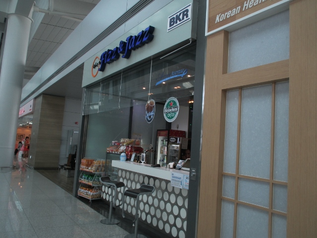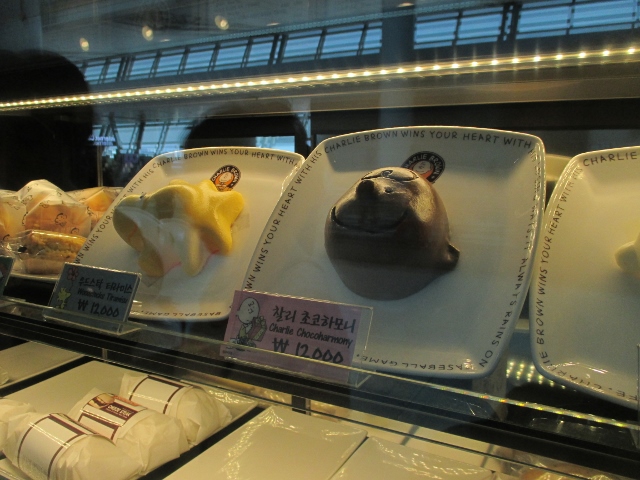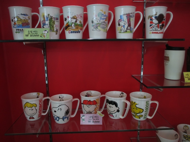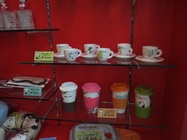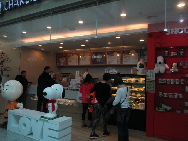 仁川国際空港内にあるカフェ。チャーリーブラウン、ウッドストックなどのキャラクターが可愛いソーサー、カップなど、小物も置いてあります。
