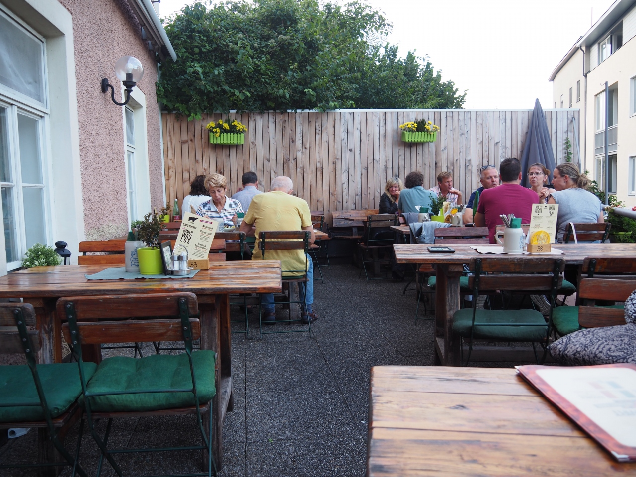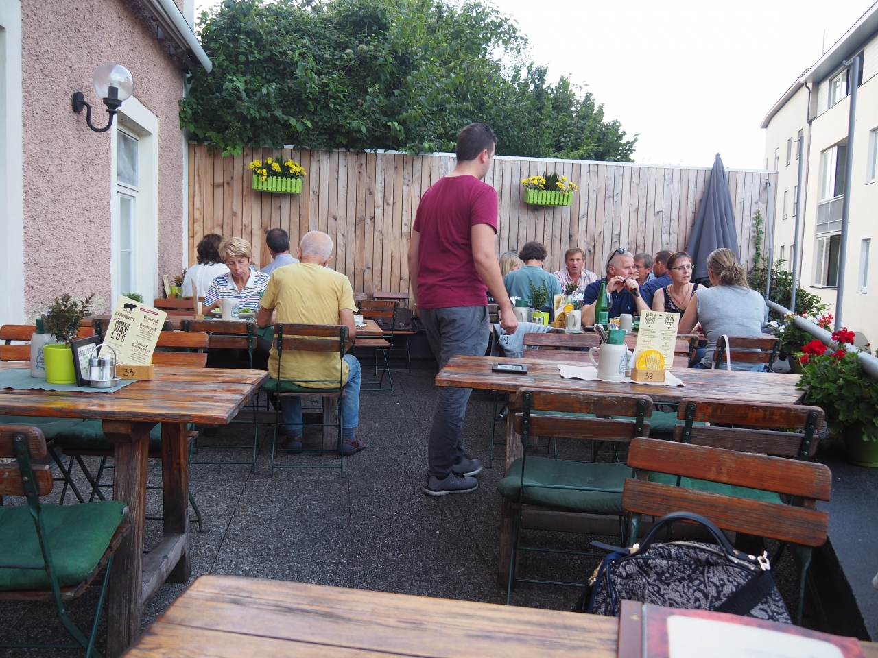 ザルツブルク観光が予定より早く終わったので、店を訪れたのが予定の午後7時より30分ほど早く、席が空くまで5分ほど待たされました。それでも手早くテラス席を準備してくれました。この時点で屋内席にはまだ余裕がありましたが、予約なしで訪れた客は並んで待つか、諦めて帰って行くのをみると、すでに予約が入っていたのだと思います。やはり予約必須の店です。