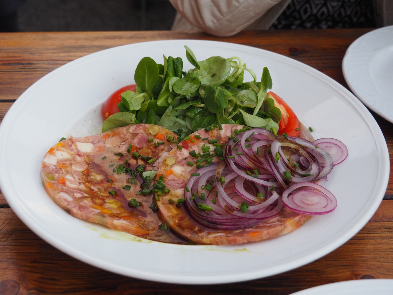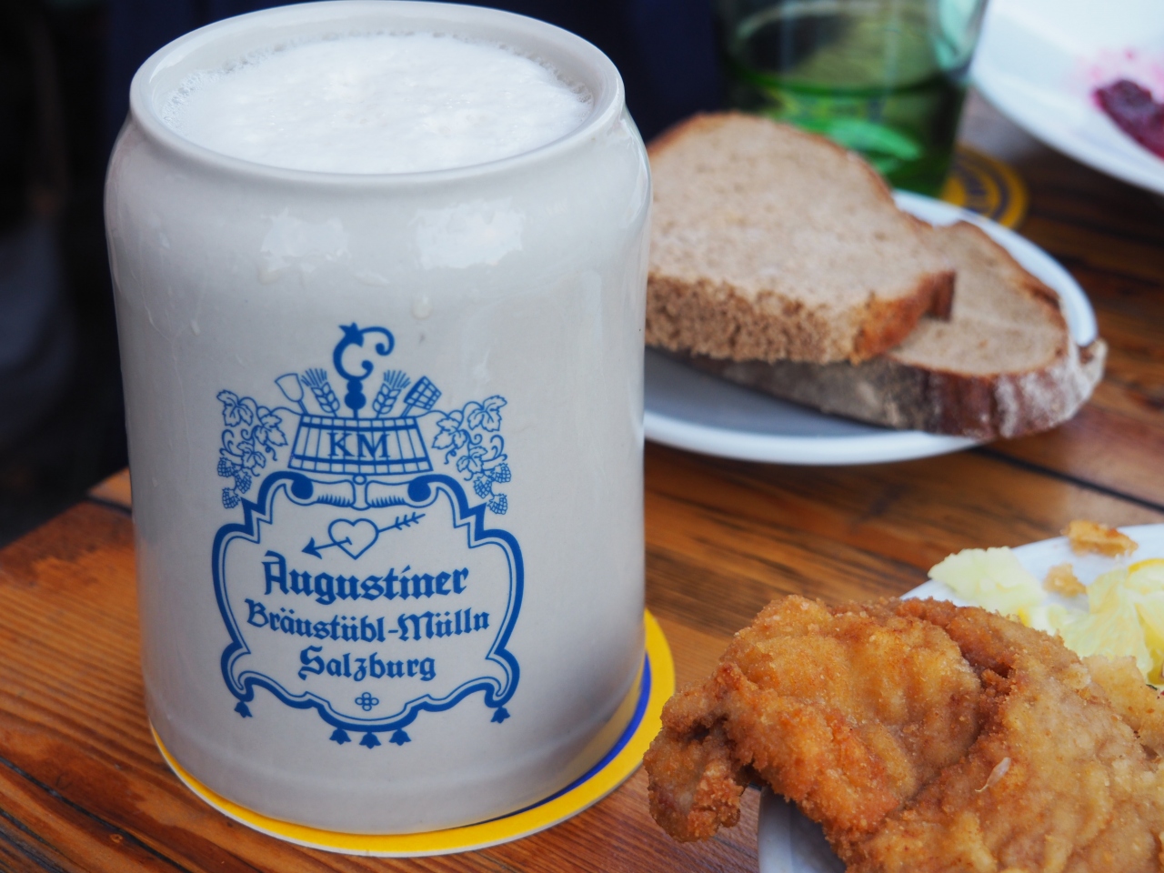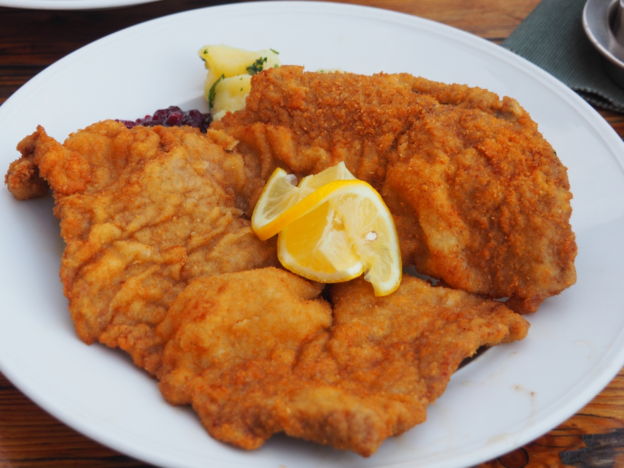 オーストリア料理といってもよく分からないので、自家製アスピック(Haussulze、煮こごり)とウィンナーシュニッツェルをオーダー、いつも通り二人でシェア。他に地ビールと水。全部で33.20ユーロ(4,300円)。リーズナブルです。味も申し分ありません。ノッケールは品物を見せてもらいましたが、あまりに大きくていかにも甘そう。パスしました。