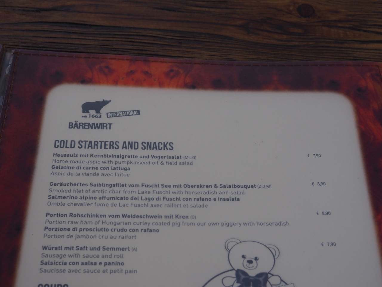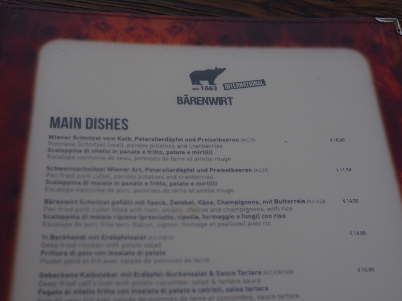 なお、店名の Bärenwirt (代用表記では Baerenwirt)はドイツ語のAウムラウトですから「ベーレンヴィルト」と読むのが正しく、「ビーレンヴィルト」は誤りです。- 旅行時期
