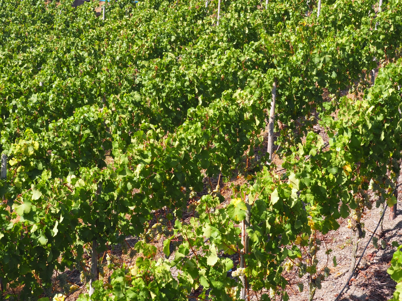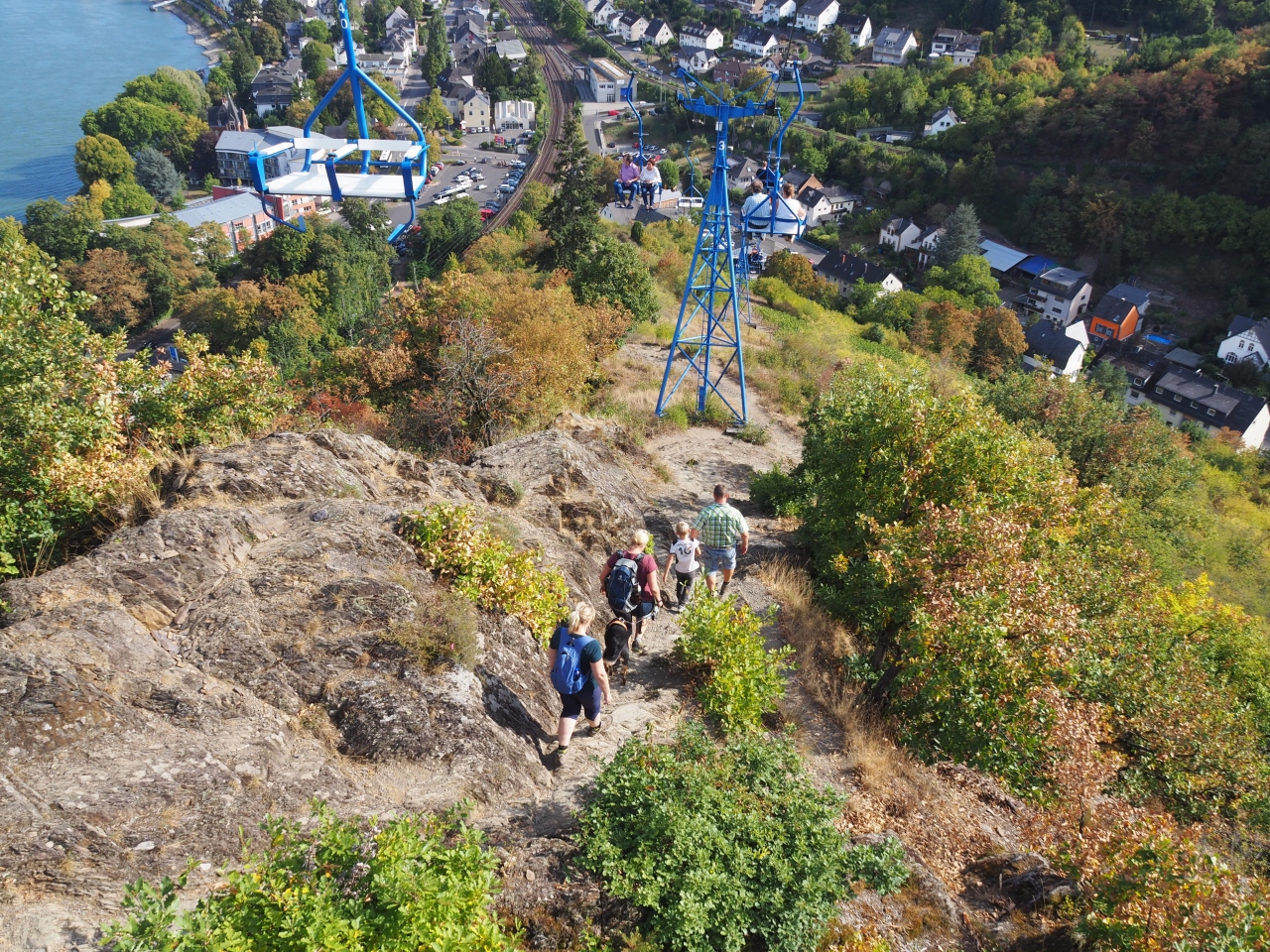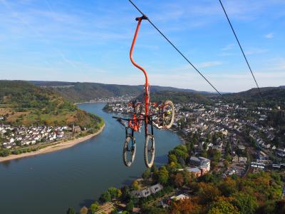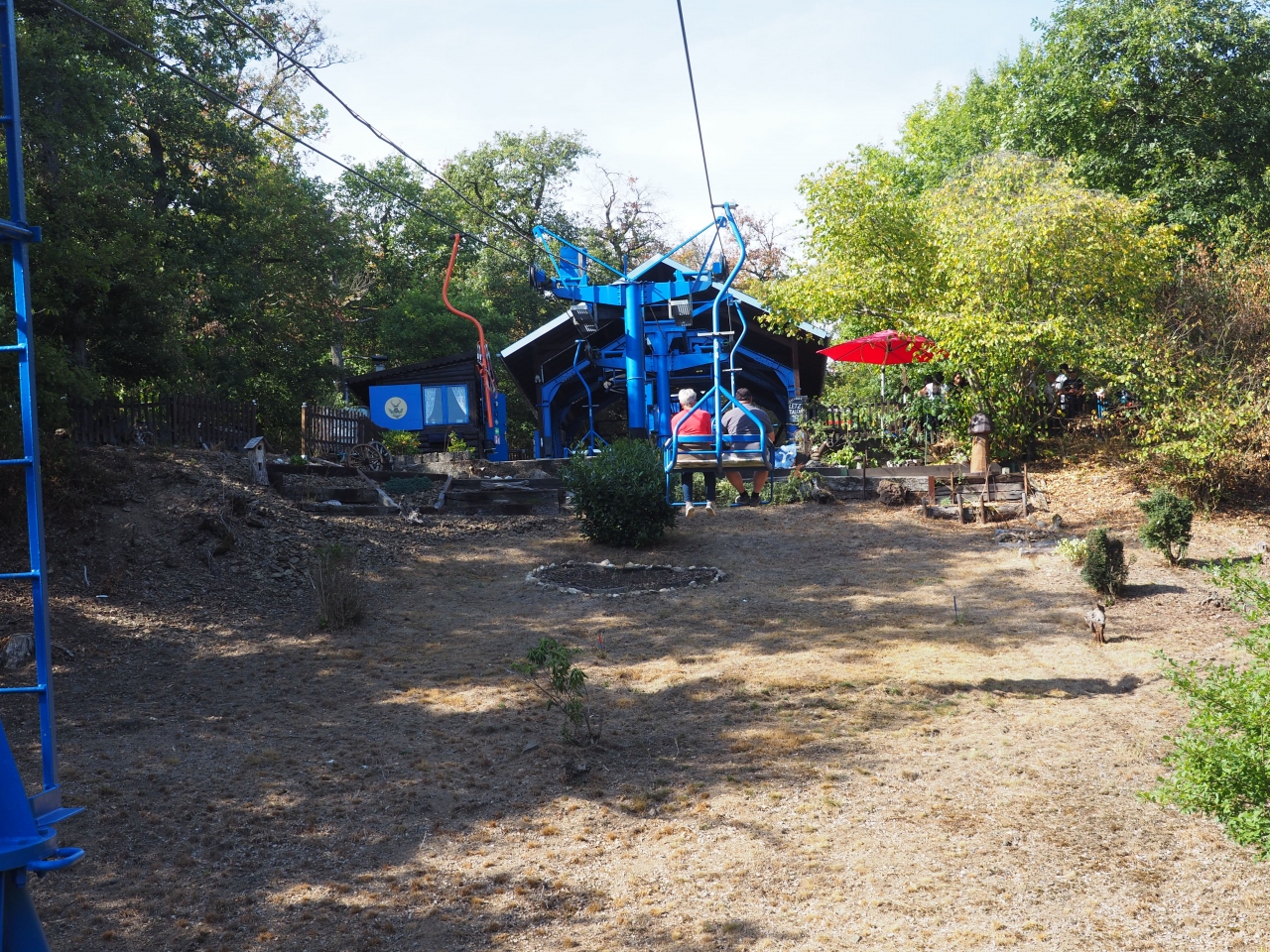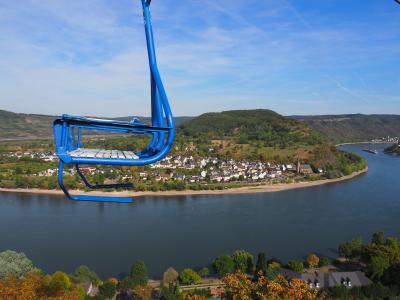 チェアリフトは葡萄畑の上を進み、ライン川渓谷やミュールタール川の谷が俯瞰できます。体を支えるのはベルト付近と足元の2本の鉄棒だけなので、それなりにスリリングな体験です。