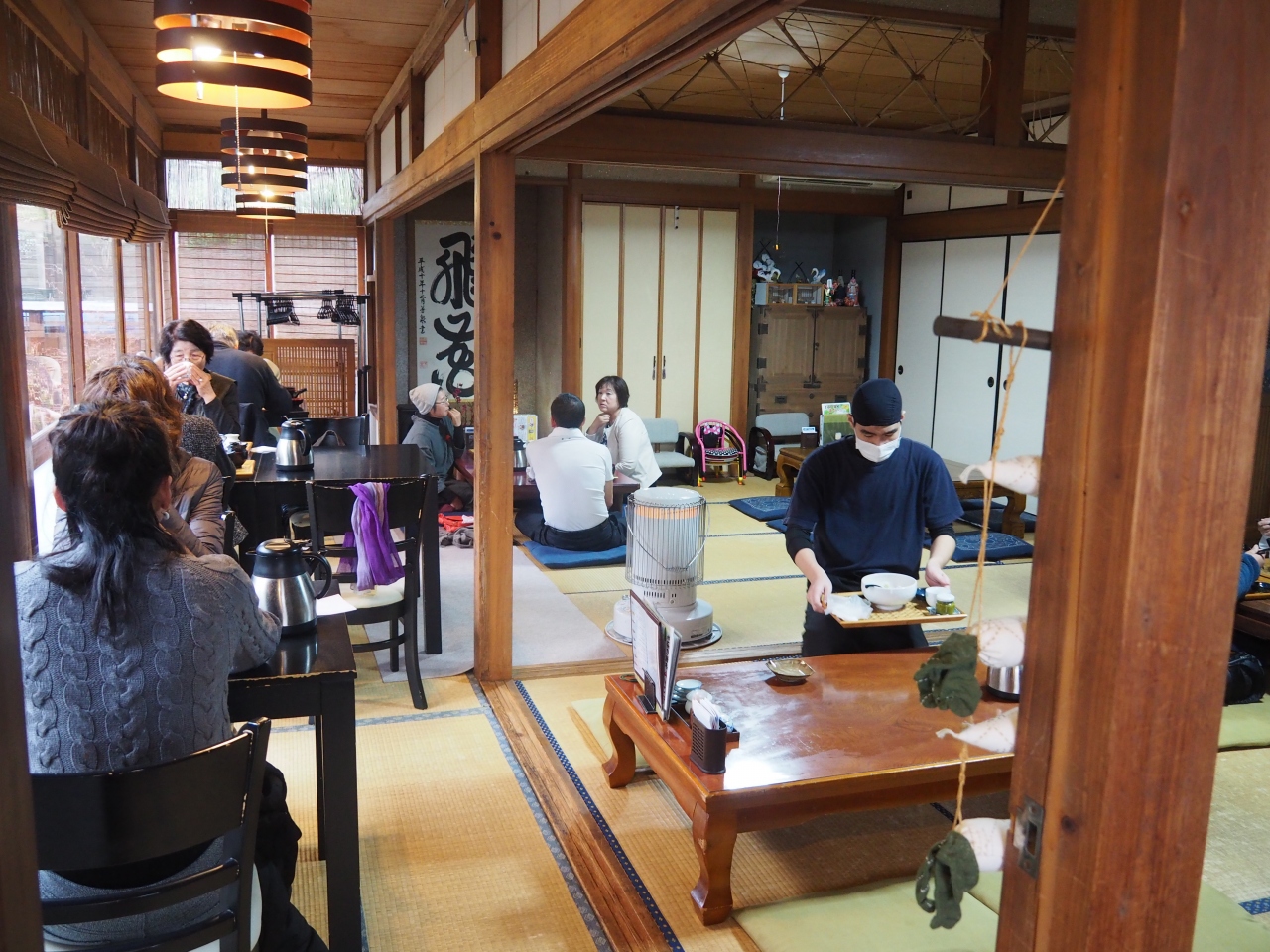 ちょうどお昼時で店内はほぼ満席、最後の1テーブルが空いていたので、待たずに席につけました。普通の民家を改造したような作りで、縁側にテーブル席が8席ほど、座敷に座卓4台、20席ほどが設けられた小さなお店です。観光客も見受けられますが、地元客が多い人気店です。