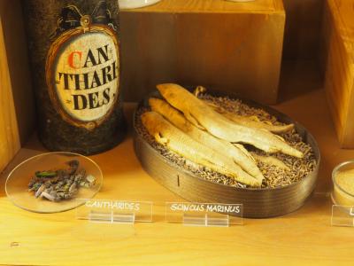 圧巻は第5室、“マテリア・メディカ” すなわち薬の材料の展示です。ここでは、19世紀まで薬局で常備されていた植物、動物、鉱物界からの薬の材料が展示されています。