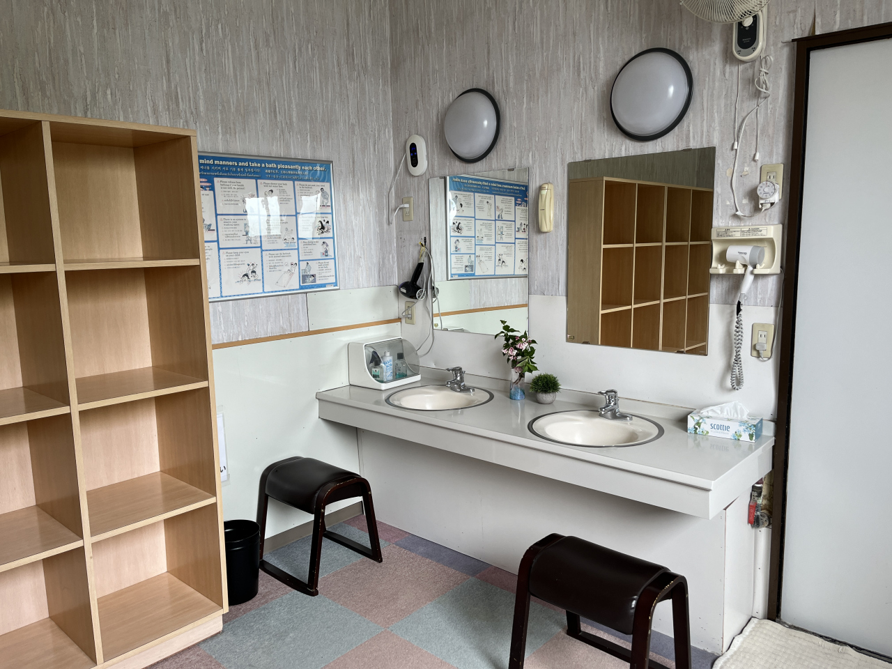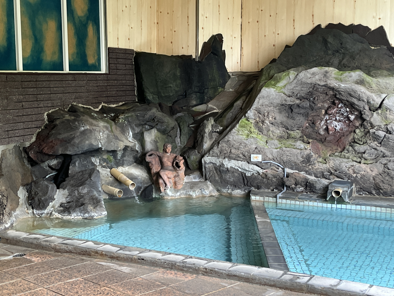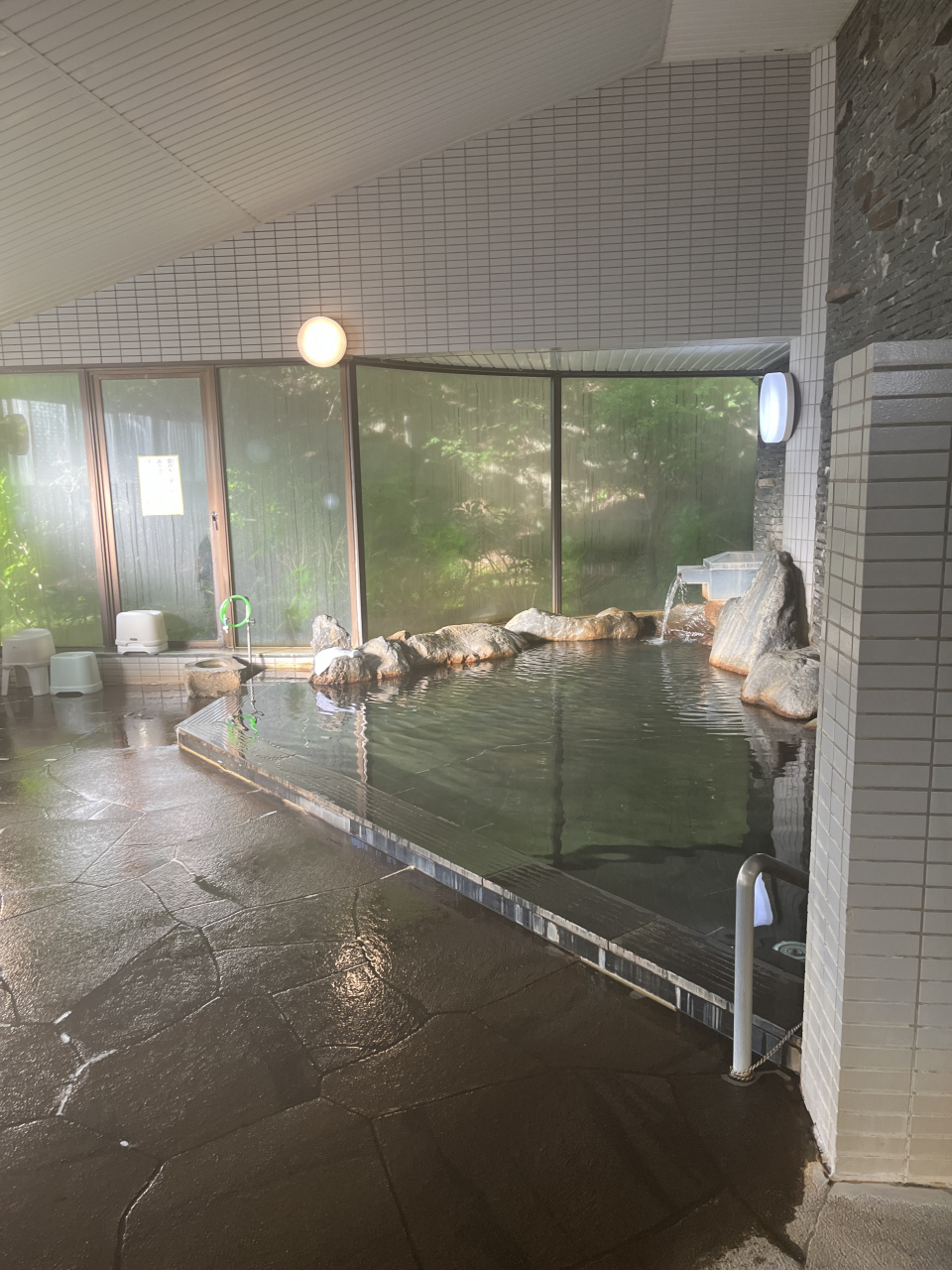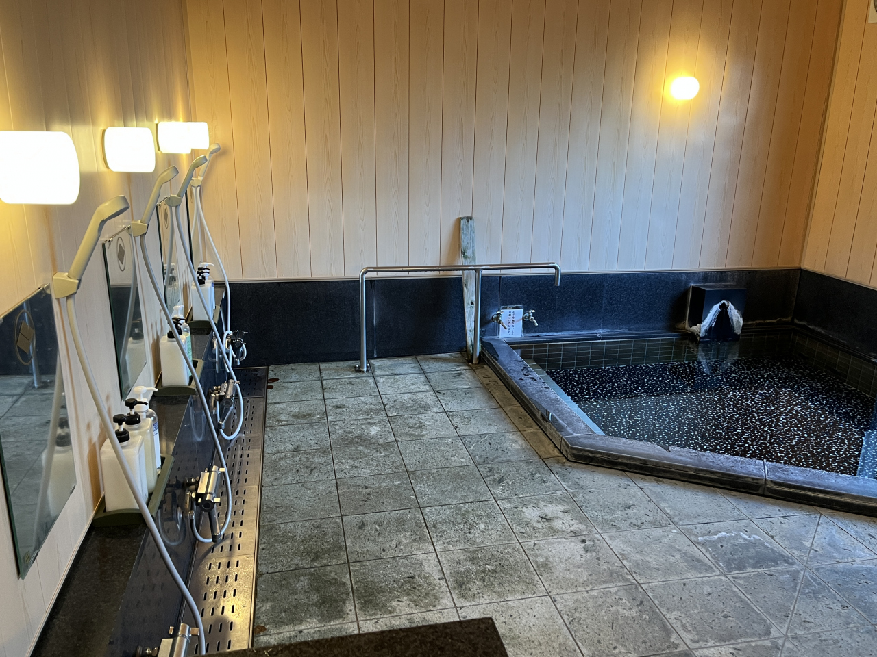 身体が落ち着いたところでこんどは岩風呂(内風呂)に入浴。洗い場が5つある広い内風呂ですが、ここも誰もいません。のんびりゆったり過ごして温泉を満喫します。