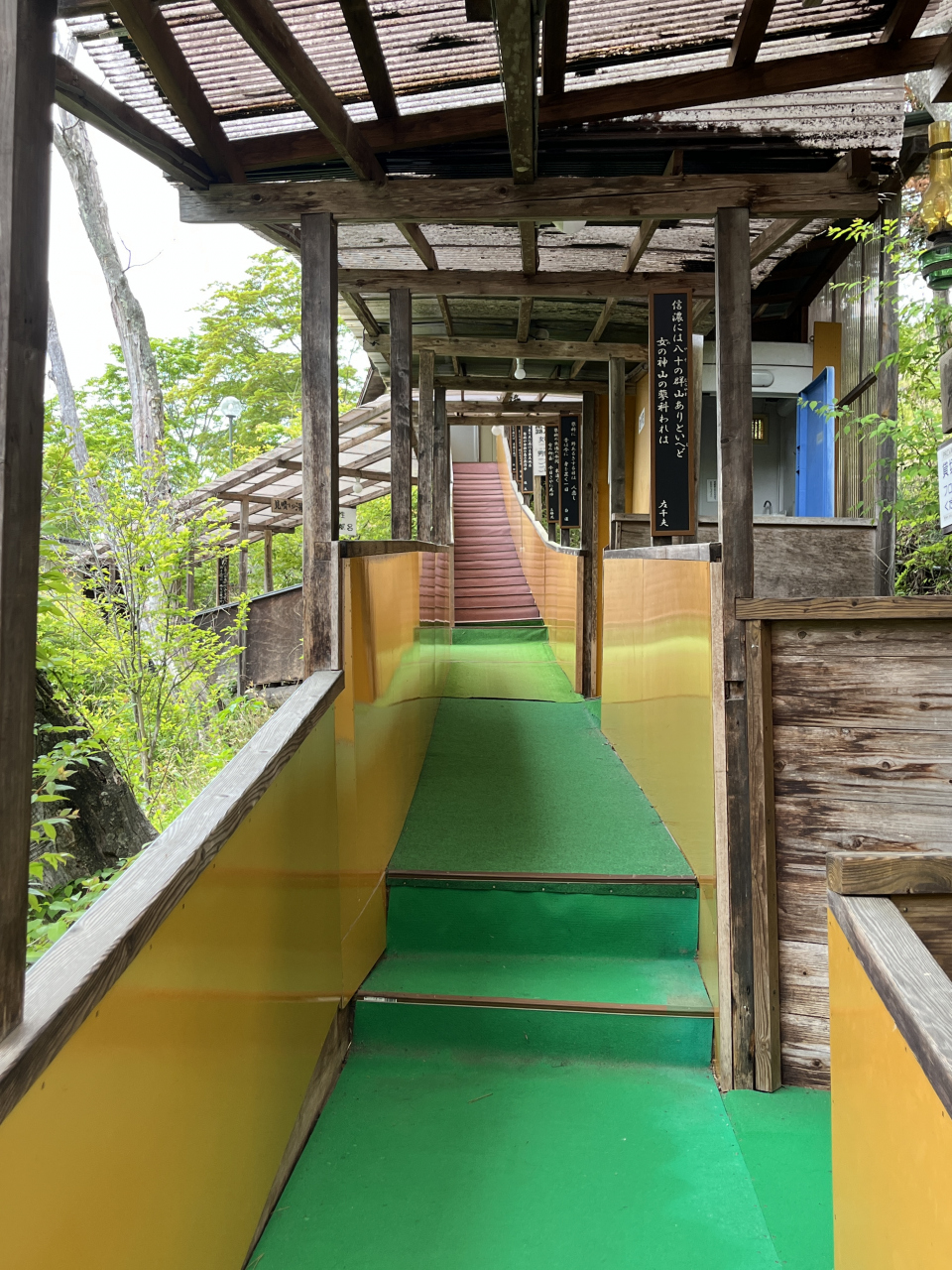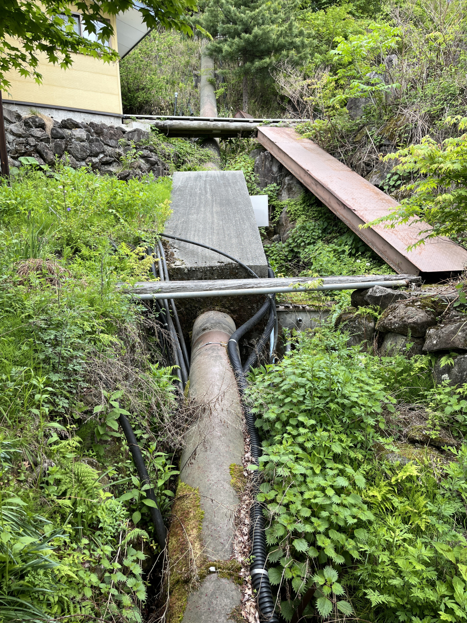 再訪したいと願いつつも長い時間が流れましたが、先日 YouTube を見ていたら当温泉が出ていたので、久しぶりにひとりで訪れました。未舗装の駐車場にいかにも昭和な渋い佇まい、初めての人はちょっと躊躇するかもしれません。施設は、男女別露天風呂が各2カ所(うち各1カ所は実質休止中)、男女別内風呂(岩風呂)が各1カ所あります。露天風呂は傾斜地に点在しており、急な廊下を登る必要があります。敷地内に水力発電の導水路が走っているほどなので、その急勾配が理解できると思います。