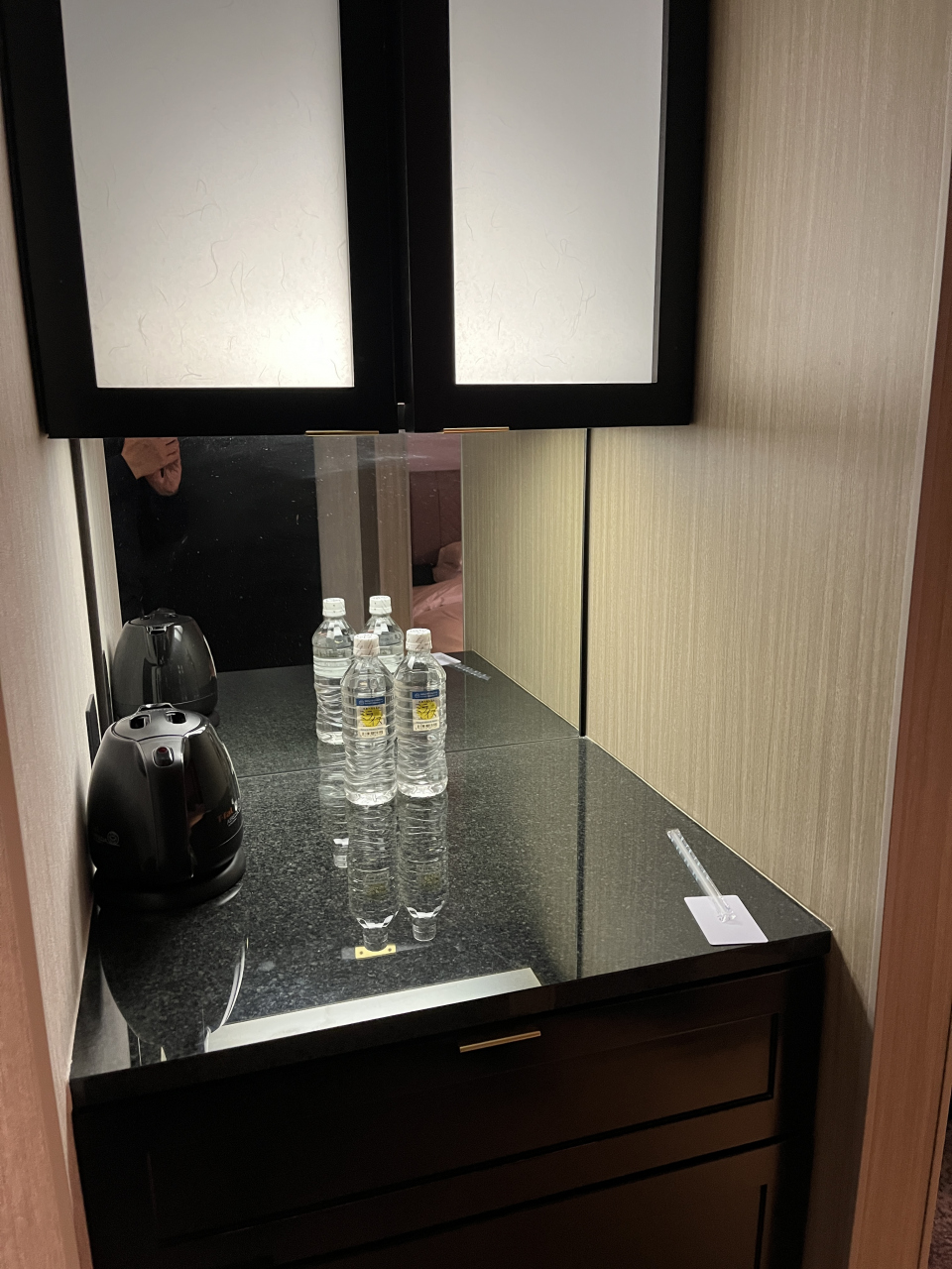 「お部屋おまかせ」で予約したら3階の和室8畳がアサインされました。トイレ、洗面所がついており、清潔で申し分ありません。冷蔵庫にはたっぷりの冷水が準備され、コップやお茶セット、茶菓子もありアメニティも十分です。