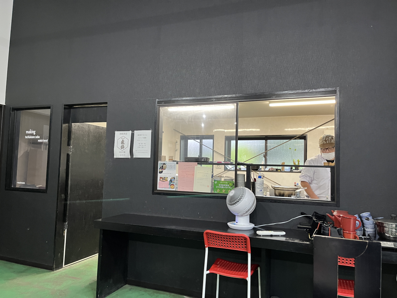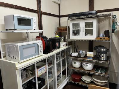 共同の炊事場には調理器具や食器が一通り準備され、自由に利用できます。隣の味処千楽で食事したり、予約代行プランの蕎麦屋やまさんの送迎サービスを利用すれば朝夕の食事をとることも可能です(朝食は弁当を届けてくれます)。それ以外は近隣にコンビニや料理店がないので、食材の持ち込みが必要です。