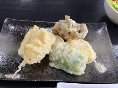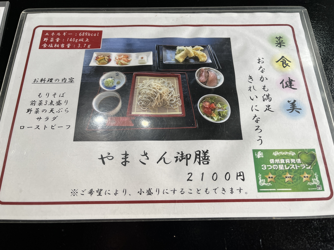 やまさん御膳は、前菜3点盛り、野菜の天ぷら、サラダ、自家製ローストビーフにもりそばのセット。どの品も申し分なく美味しい。もりそばは、もちろん青木村特産のタチアカネを使用していて、香り高くみずみずしい。野菜天ぷらも素材が新鮮で揚げ具合も最高。大満足です。