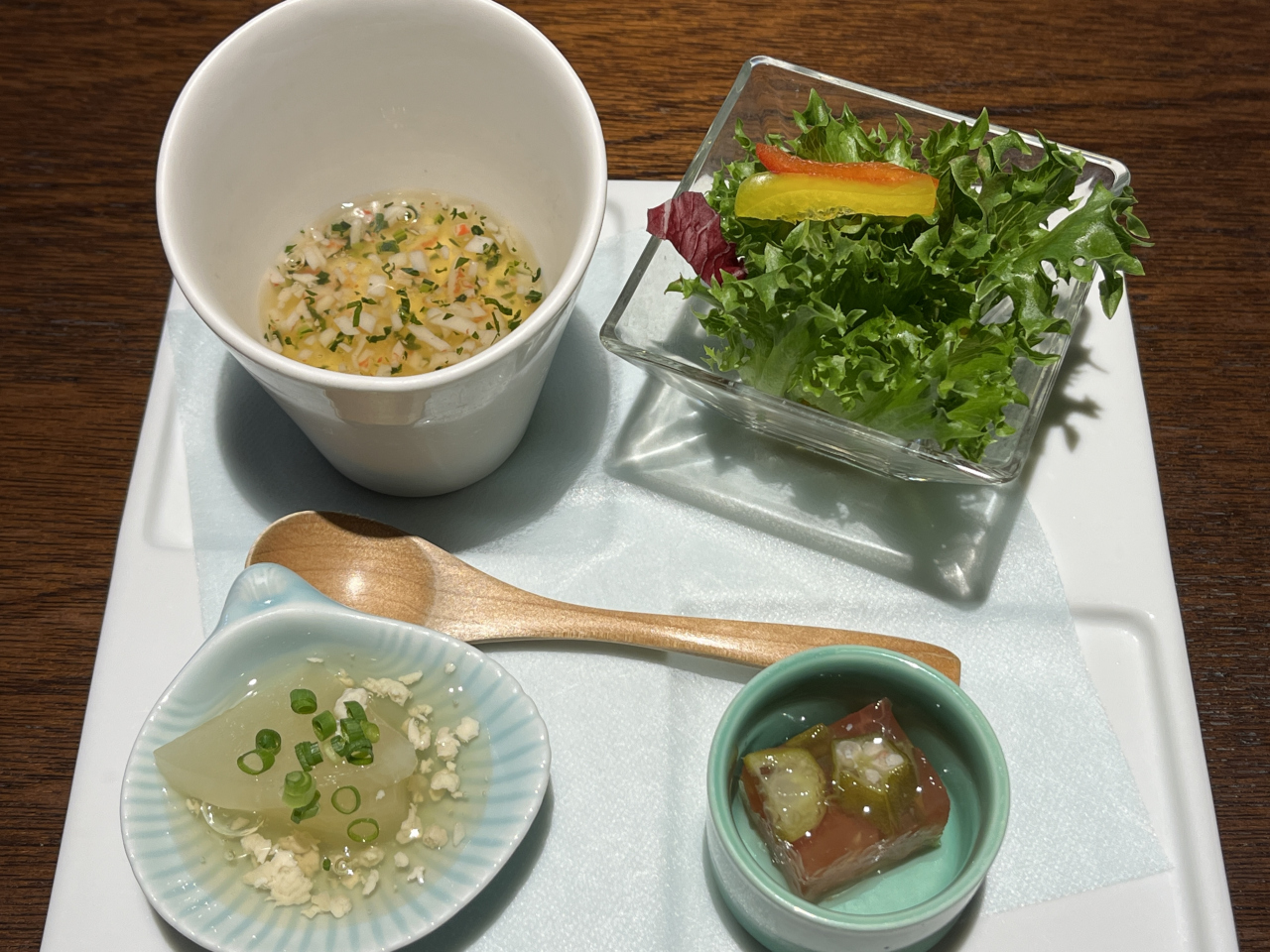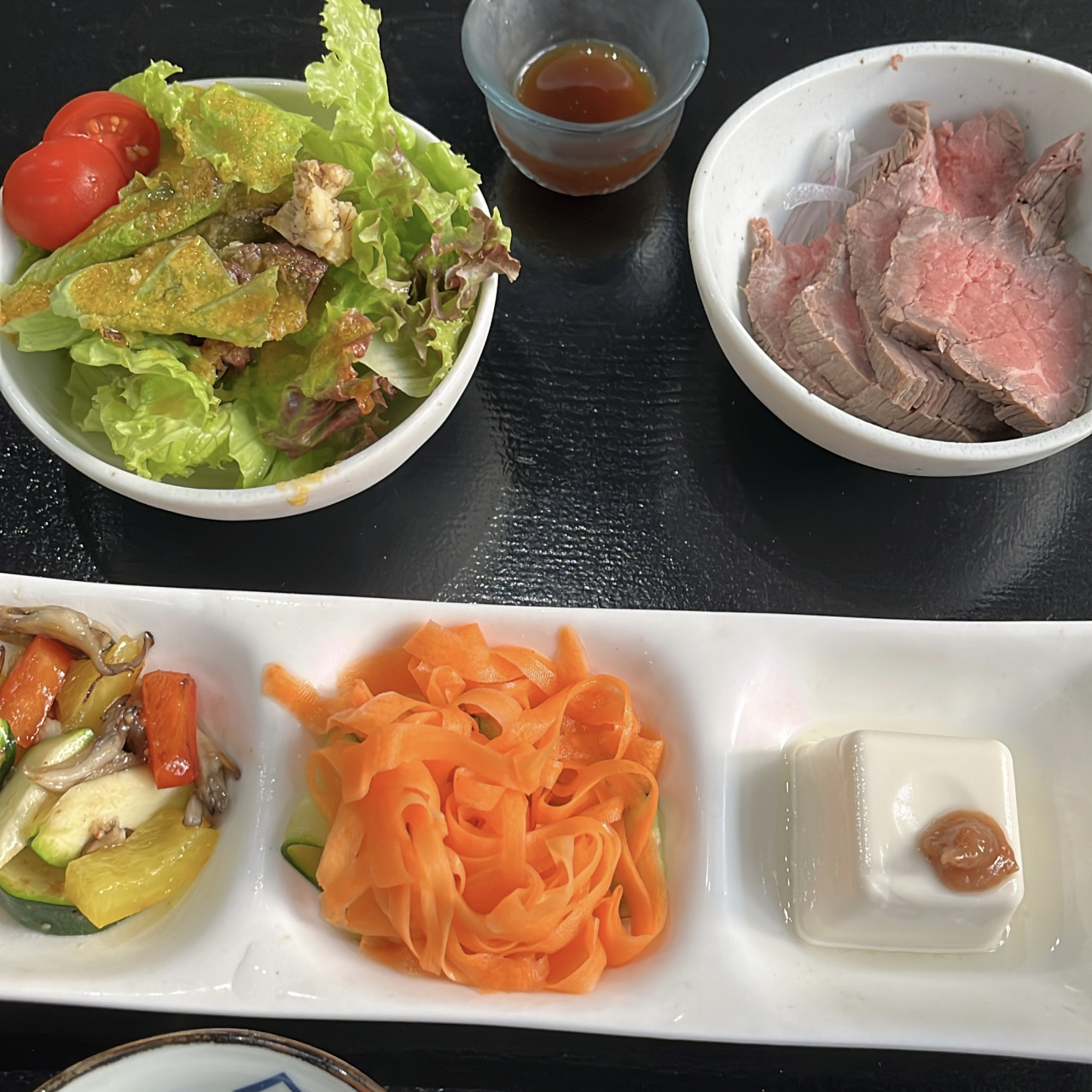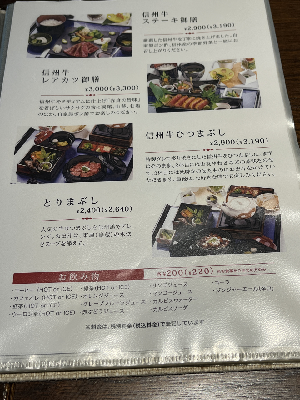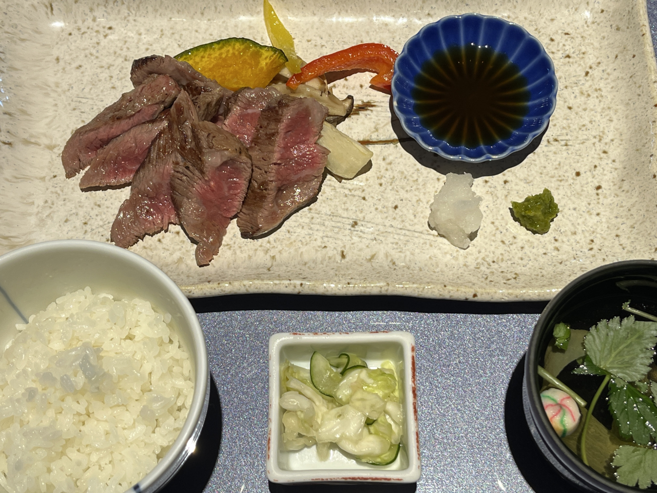 信州牛ステーキ御膳 2,900円をチョイス。料理は前菜4品にメイン、ご飯、吸い物、新香のラインナップ、プラス300円で吸い物を蕎麦に変更できるようです。料理は彩りも美しく、それぞれに美味しく満足です。