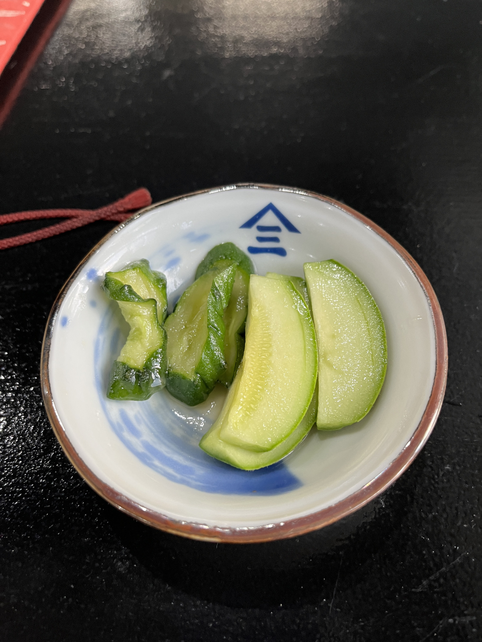 ツキだしは山形産メロンときゅうりの辛子漬け。個性的で美味です。