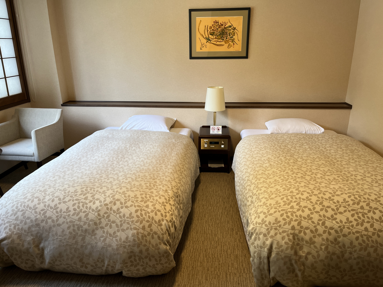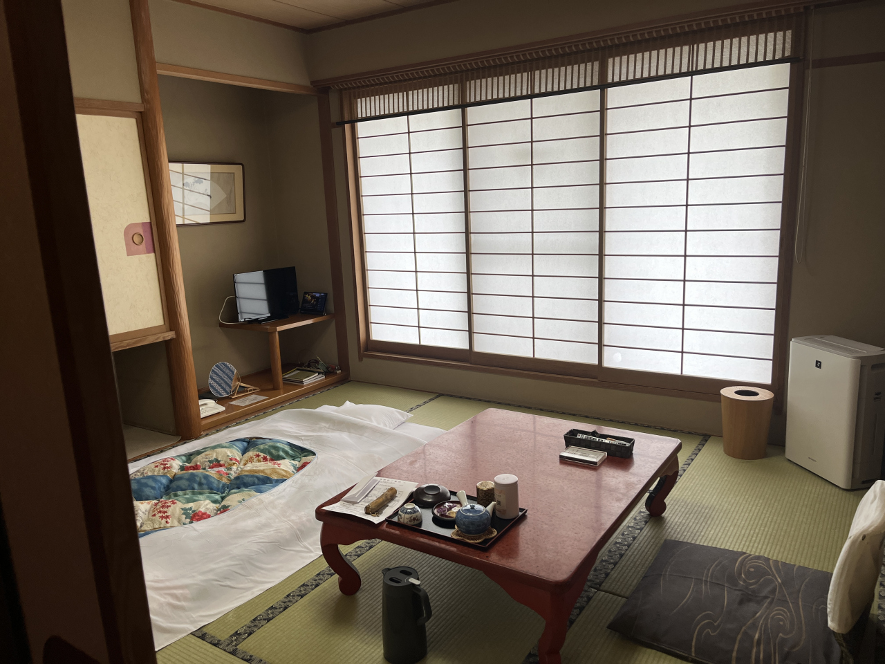 チェックイン時刻前に到着しましたが、快く受け入れていただきました。部屋は和洋室、7.5畳、広縁付きの和室とツインベッドルームが一体となった部屋で広々と快適に過ごせます。宿の標高は1,200メートル、冷房はありませんが朝夕は涼しく、扇風機だけで十分です。静かで治安の良い場所なので窓を開け放しておいても全く問題はありません。部屋に浴室もありますが、リニューアルしたばかりの大浴場(温泉ではありません)が使えて快適です。