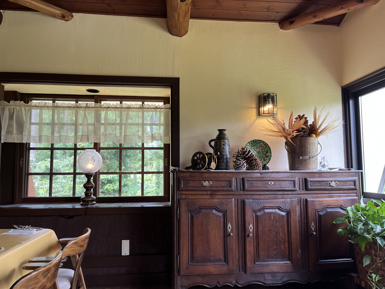 窓から妙高山が望め、アンティークに囲まれたインテリア。期待が高まります。