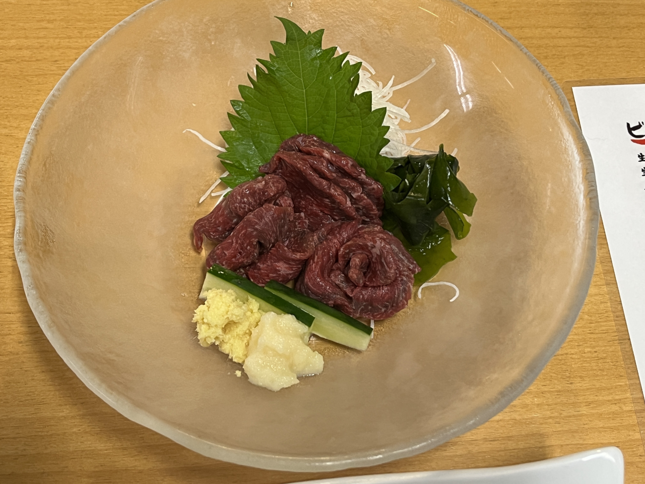 食事は、蓼科牛ステーキプランをチョイス、馬刺しを追加予約しておきました。コースには佐久名物「鯉の旨煮」がついています。ボリュームたっぷりで料理は全て美味しい。