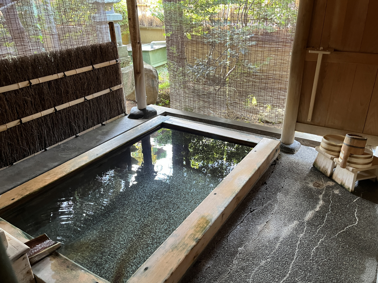 やはり一番の魅力はぬる湯の沓掛温泉。沓掛温泉1号〜3号の混合源泉で泉温は35.3°C。無色透明、微かに硫黄臭の漂うアルカリ性単純温泉です。先着順で3コマまで予約できる貸切枠は1時間単位なので、気兼ねなくゆったりと温泉に浸ることができます。それ以外の時間帯も空いていれば、申し込んで利用可能、まさに湯治三昧です。