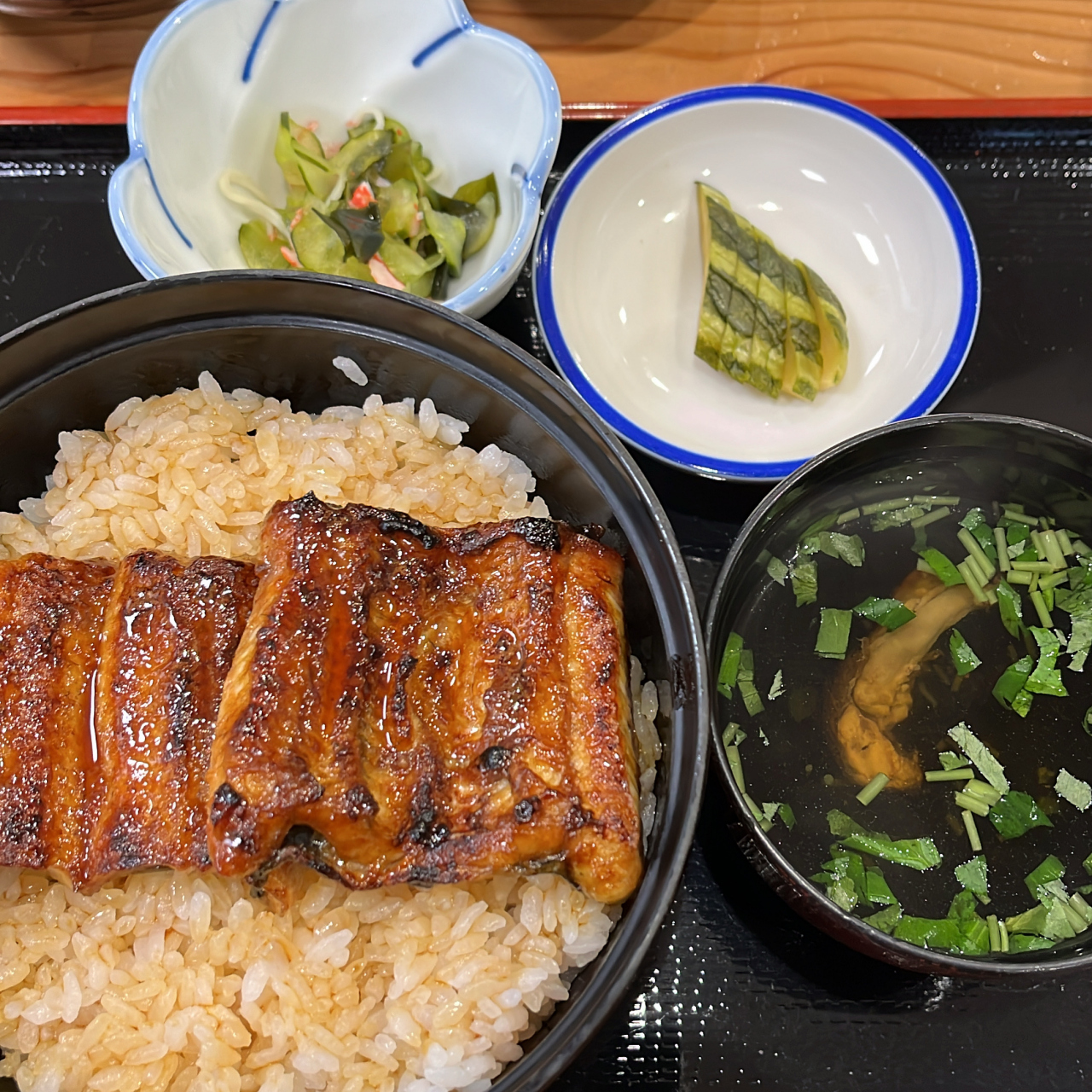 歳をとって食欲は以前ほどではないし、ランチでもあり、うな丼(並)2,600円を注文。どんぶり一杯のご飯に蒲焼が2切れ、肝吸いと小鉢、瓜の漬物のセットです。